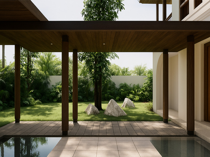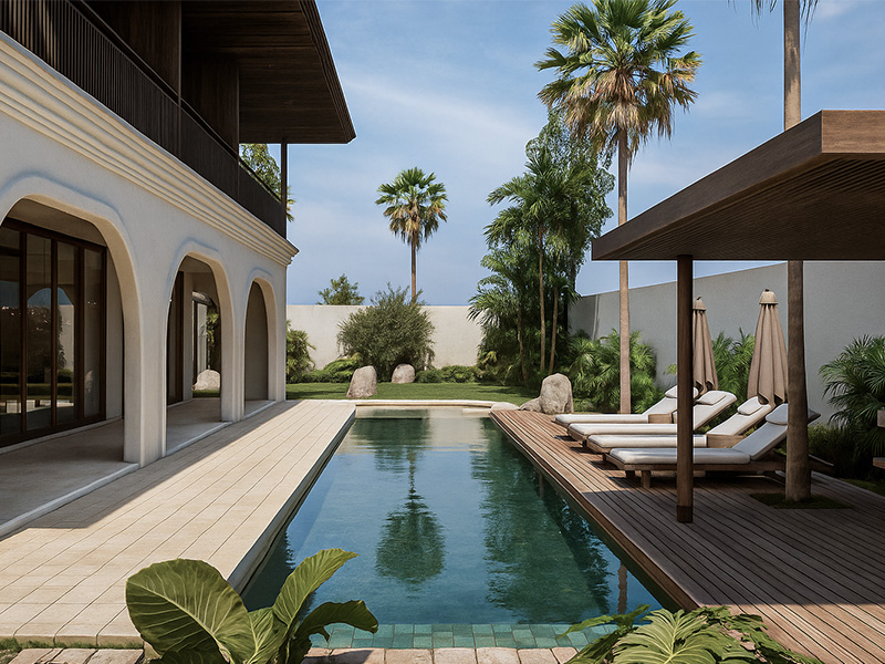 The first floor of the house opens completely toward the garden and pool. A long east-facing swimming pool brings morning sunlight into the home, creating a serene tropical atmosphere. The upper floor contains four bedrooms, while the ground floor includes one guest room and open living spaces that connect directly to the outdoors.