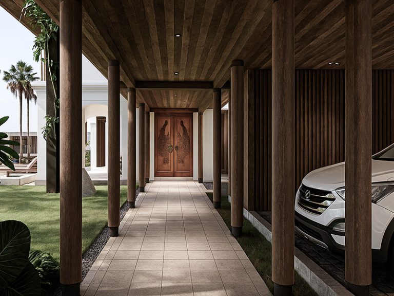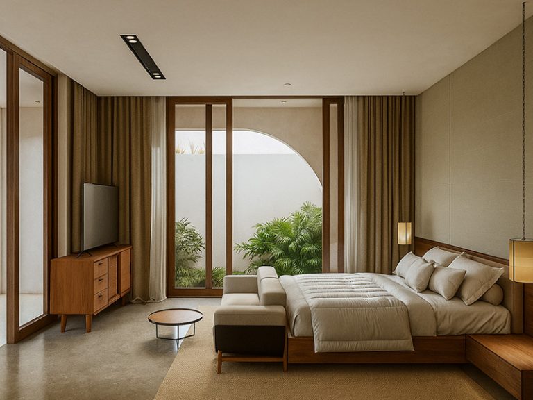 The architecture combines postmodern elements with a Balinese touch. The clean facade, arched openings, and natural wooden materials create a warm and elegant character. Large openings ensure natural airflow and cross ventilation, making air conditioning almost unnecessary.