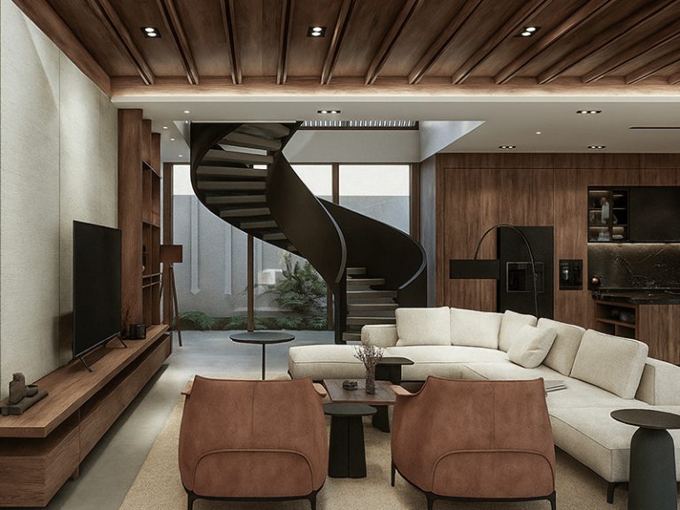 Arsitektur rumah ini memadukan elemen postmodern dengan sentuhan khas Bali. Fasad yang bersih, bukaan lengkung, serta penggunaan material kayu alami menghadirkan karakter hangat dan elegan. Bukaan yang lebar memungkinkan sirkulasi udara alami yang baik, sehingga penggunaan pendingin ruangan menjadi minimal.