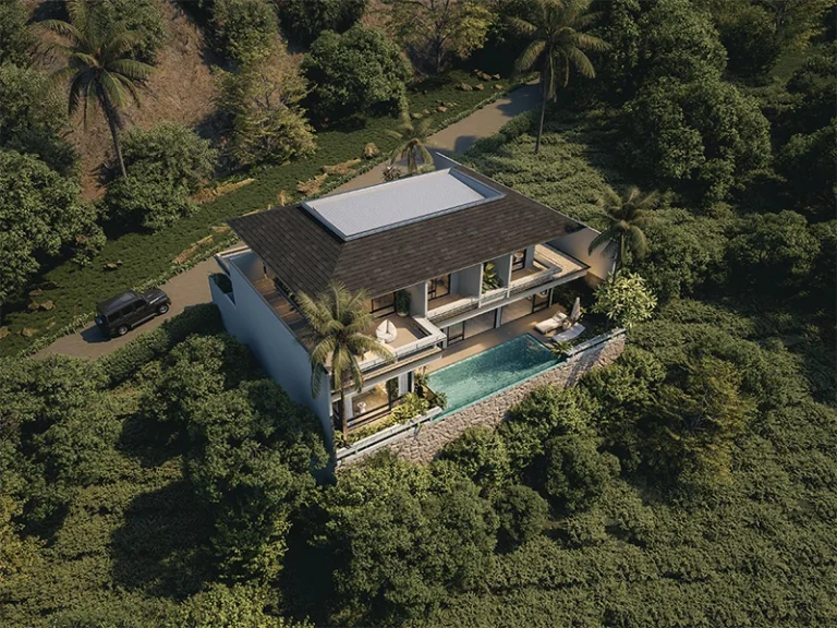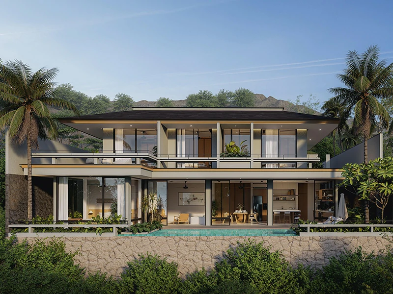 The architecture focuses on comfort, openness, and natural harmony. Large openings allow optimal natural light and cross-ventilation, creating a calm and refreshing living experience. Surrounded by tropical vegetation, the house perfectly integrates indoor and outdoor spaces, forming a private sanctuary above the coastal hills of Bali.