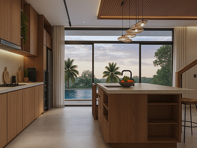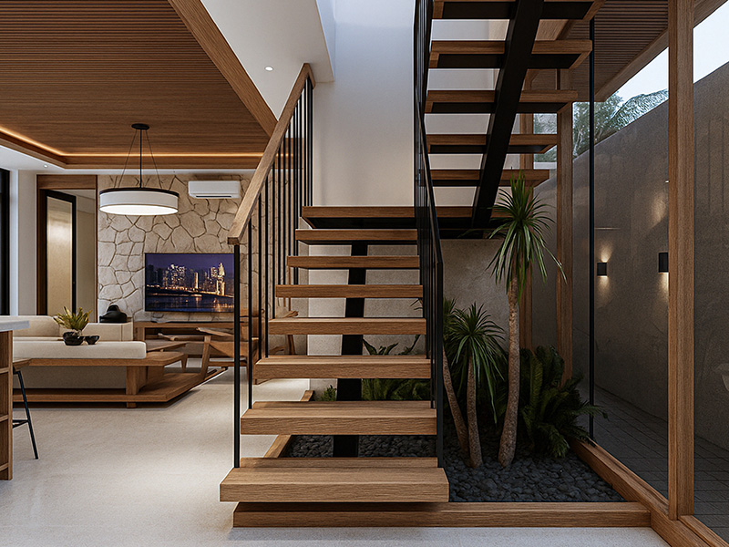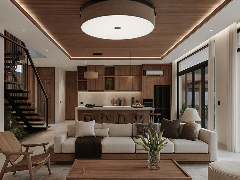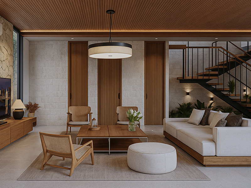 Warm natural materials such as wood, natural stone, and textured finishes define the tactile character of the home. Wooden structures and soft tones create a timeless connection between interior and exterior, while generous openings allow natural light and ventilation to flow effortlessly.