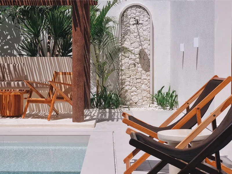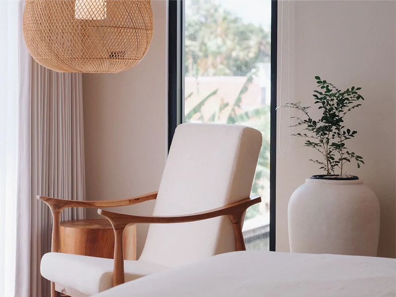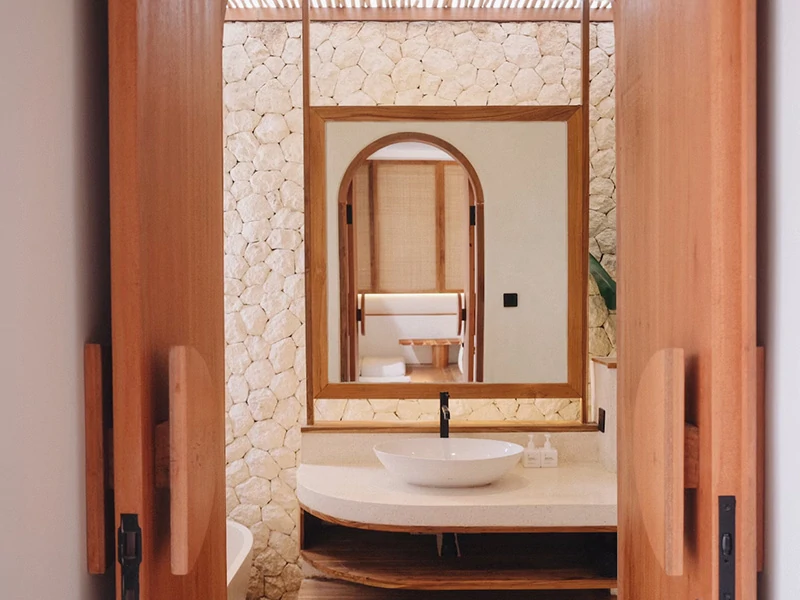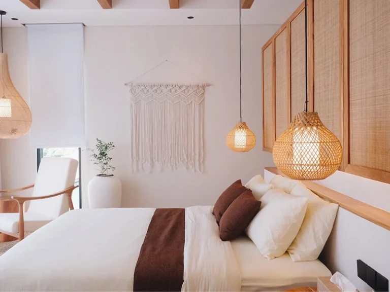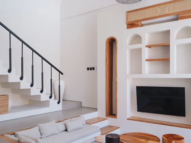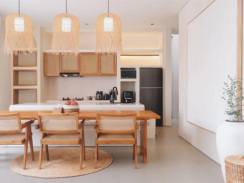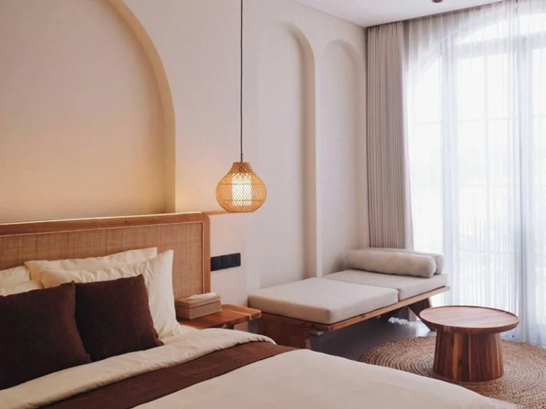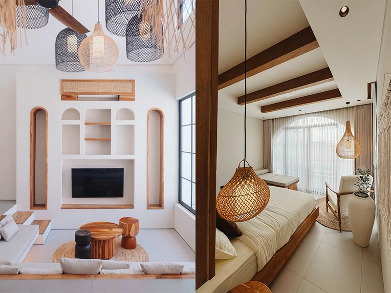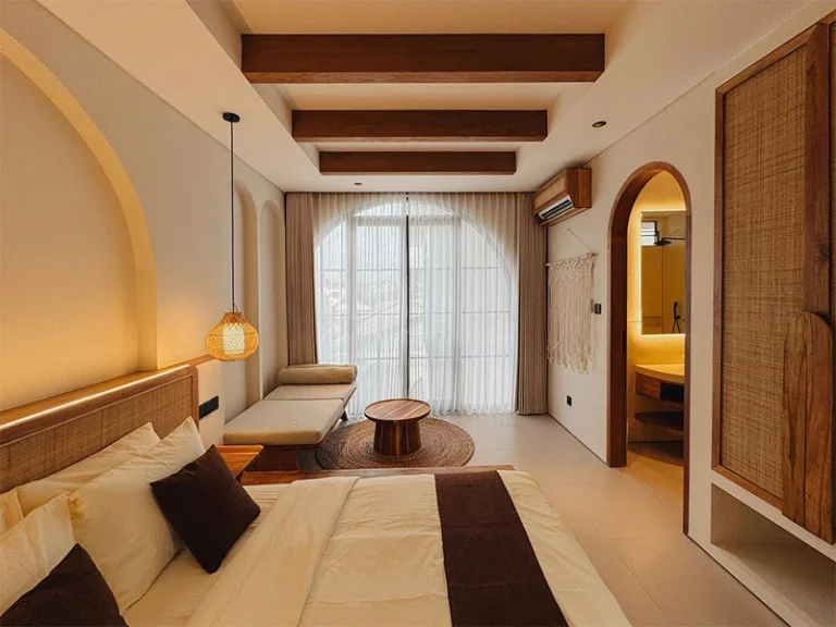 The interior combines natural textures and warm lighting, producing a tranquil balance between elegance and comfort. Wooden beams, rattan accents, and neutral materials bring depth and authenticity to the space — offering a calm living experience for modern travelers and homeowners alike.