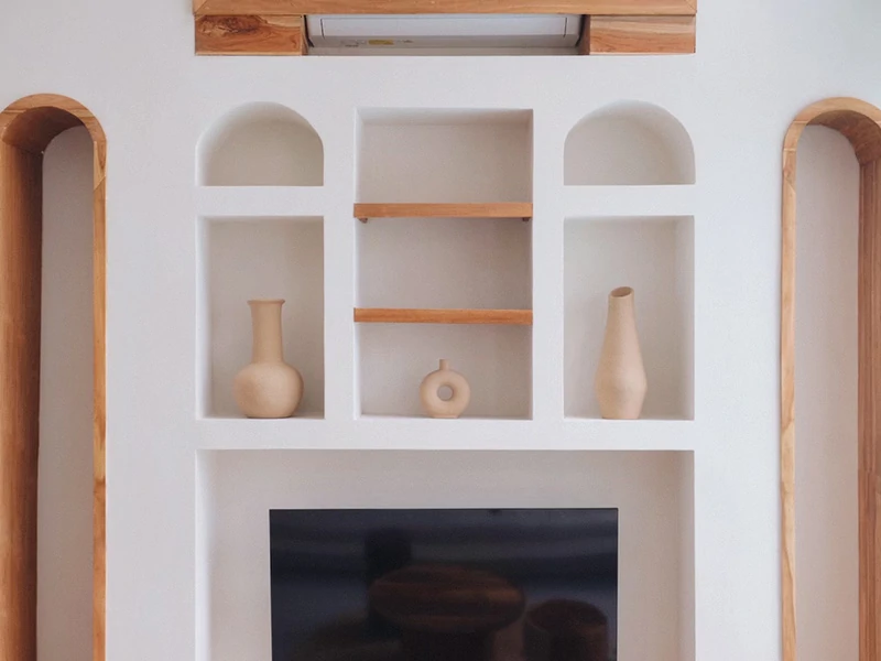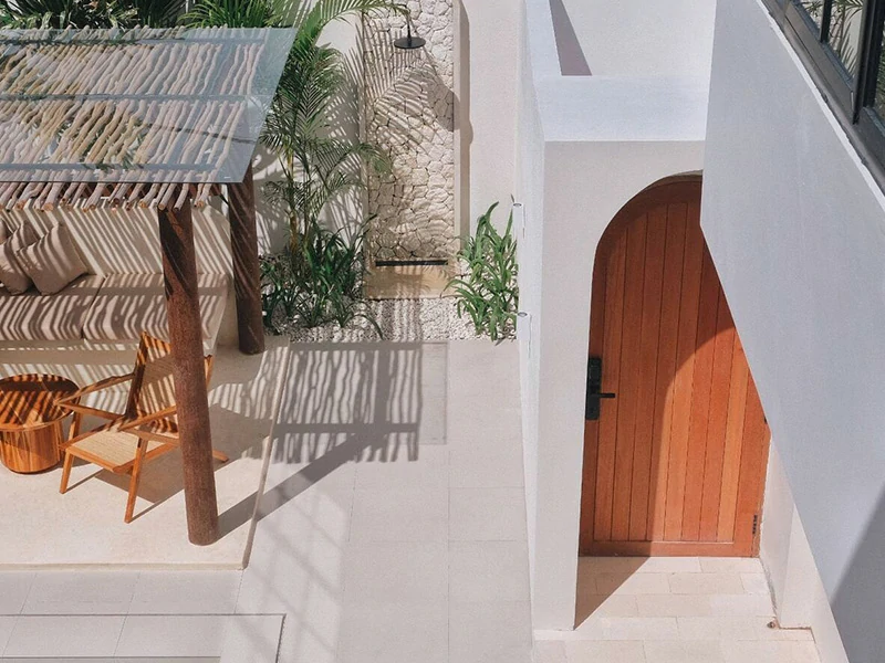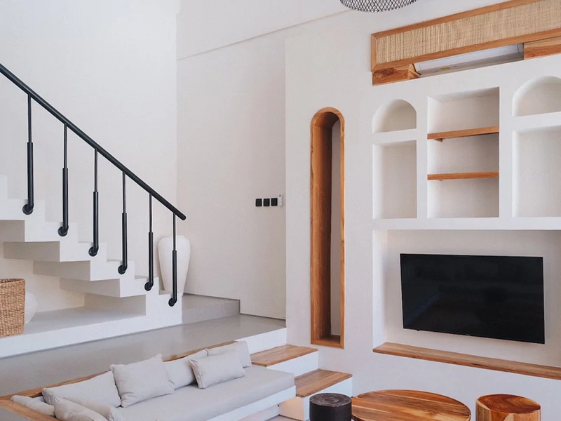 Desain villa ini menonjolkan warna putih bersih, bukaan lengkung, serta material kayu alami yang menciptakan suasana lembut dan nyaman. Kombinasi tersebut menghadirkan karakter khas Mediterania yang terasa menyatu dengan gaya hidup tropis di Bali.
